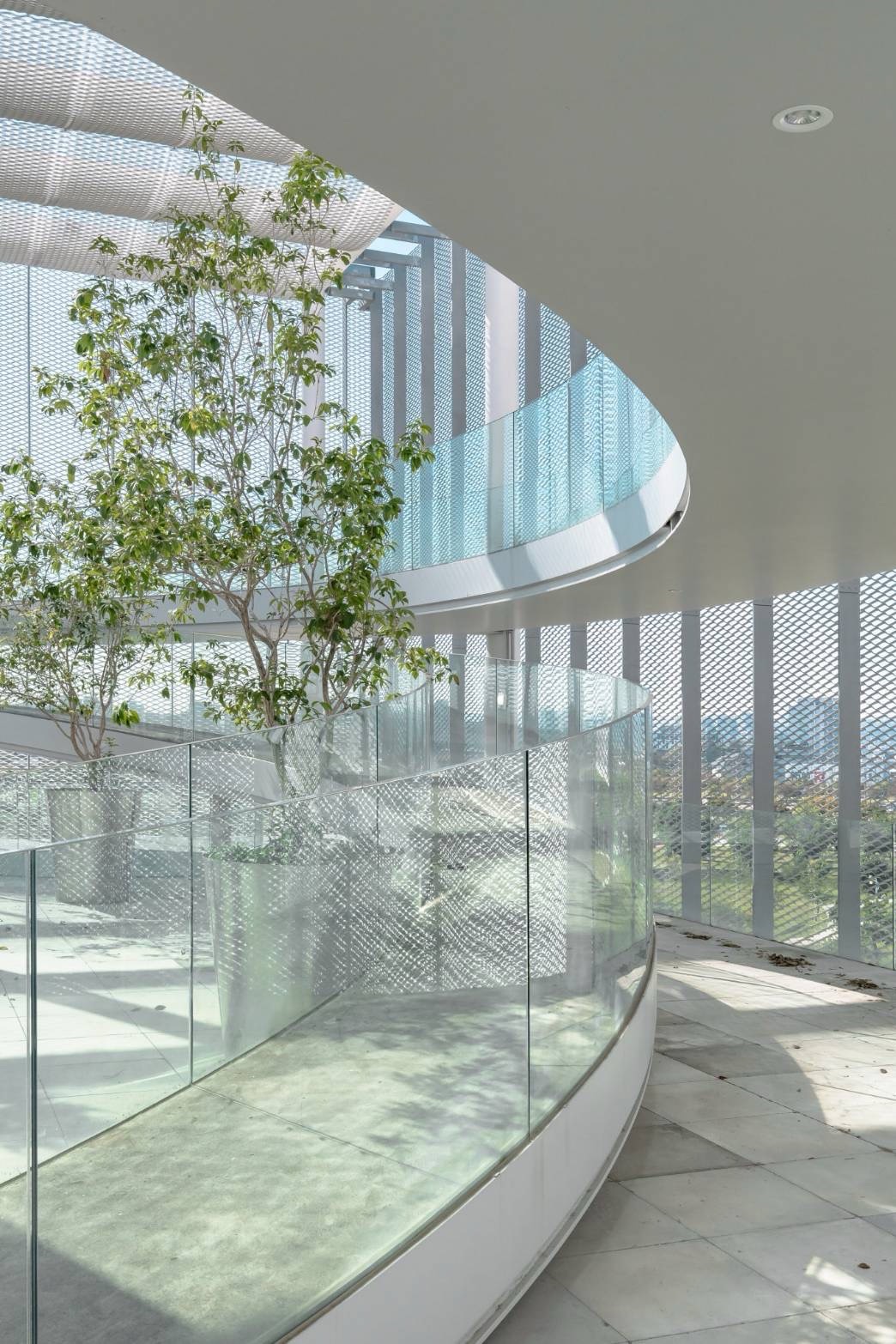 此外,由8個大小不一的建築盒子組成的外觀,採擴張網帷幕設計,營造出輕盈且通透的視覺效果,陽光透過金屬網灑入室內,隨著光影變化展現不同層次感,讓建築彷彿與空間融為一體;室內二樓通廊則採「無落柱」設計,使大廳視覺更加寬敞通透,彷彿空間在漂浮。這一切得以實現,全靠導入109座「單擺摩擦隔震器」技術,不僅提升結構安全,也大幅減少鋼構使用量,使建築輕盈如藝術品般懸浮於空間中。