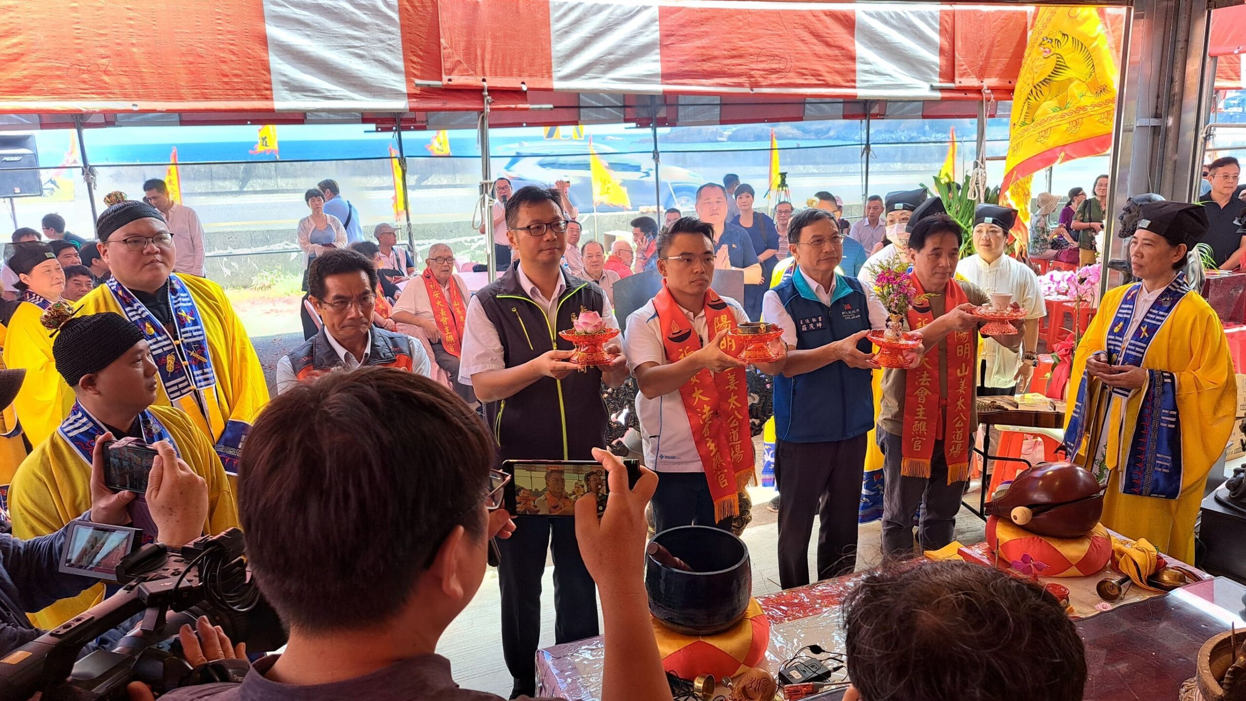 以七星燈聞名海內外的陽明山姜太公道場21日,於新北市瑞芳水湳洞舉辦基隆山姜太公道場成立大會暨姜太公、北斗星君及地藏王菩薩祝壽大典。包括立委洪孟楷、台綜院創辦人劉泰英、資深藝人李㼈及眾多海內外信眾前來祝賀,慶典依循傳統道家儀軌舉行,場面盛大莊嚴。主席羅世新表示,基隆山為護國神山,暗藏著道場多年尋覓而得之的全台唯一龍龜大寶穴,目前正逢台海局勢風雲詭譎,各界更預測2027年中共建軍百年,兩岸關係將面臨最嚴厲挑戰,經姜太公指示,必須在此設立分道場,以保佑台灣寶島2300萬人民幸福平安。