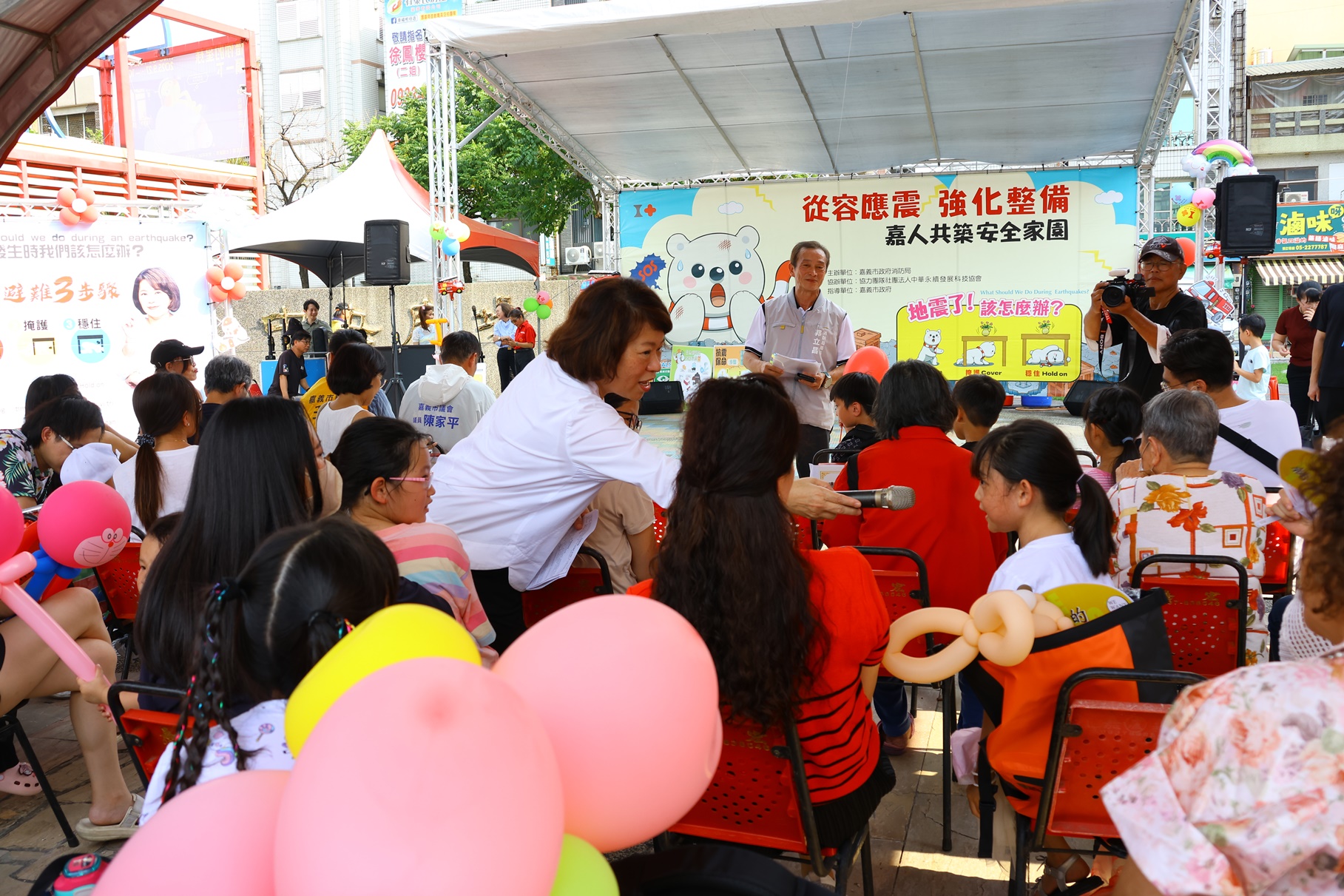 黃敏惠表示,當下的人們面對極端氣候的挑戰及各種可能突發的天災,唯有事前萬全的準備、將防災的意識落實在生活中才能確實的防災、減災。921大地震雖已距今20多年,但仍讓許多經歷過的民眾餘悸猶存。嘉義市在9月防災月於每所學校及社區進行防震宣導與教育,希望讓防災意識落實並普及於生活中,也期待透過今日的設攤宣導喚起所有人對防災概念的重視,自救然後救人。祈願國泰民安,也希望多一分的準備能少一分的傷害。
