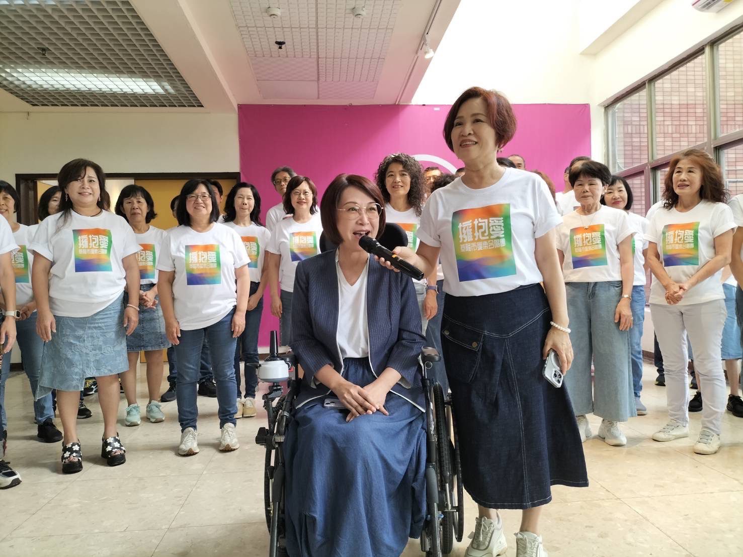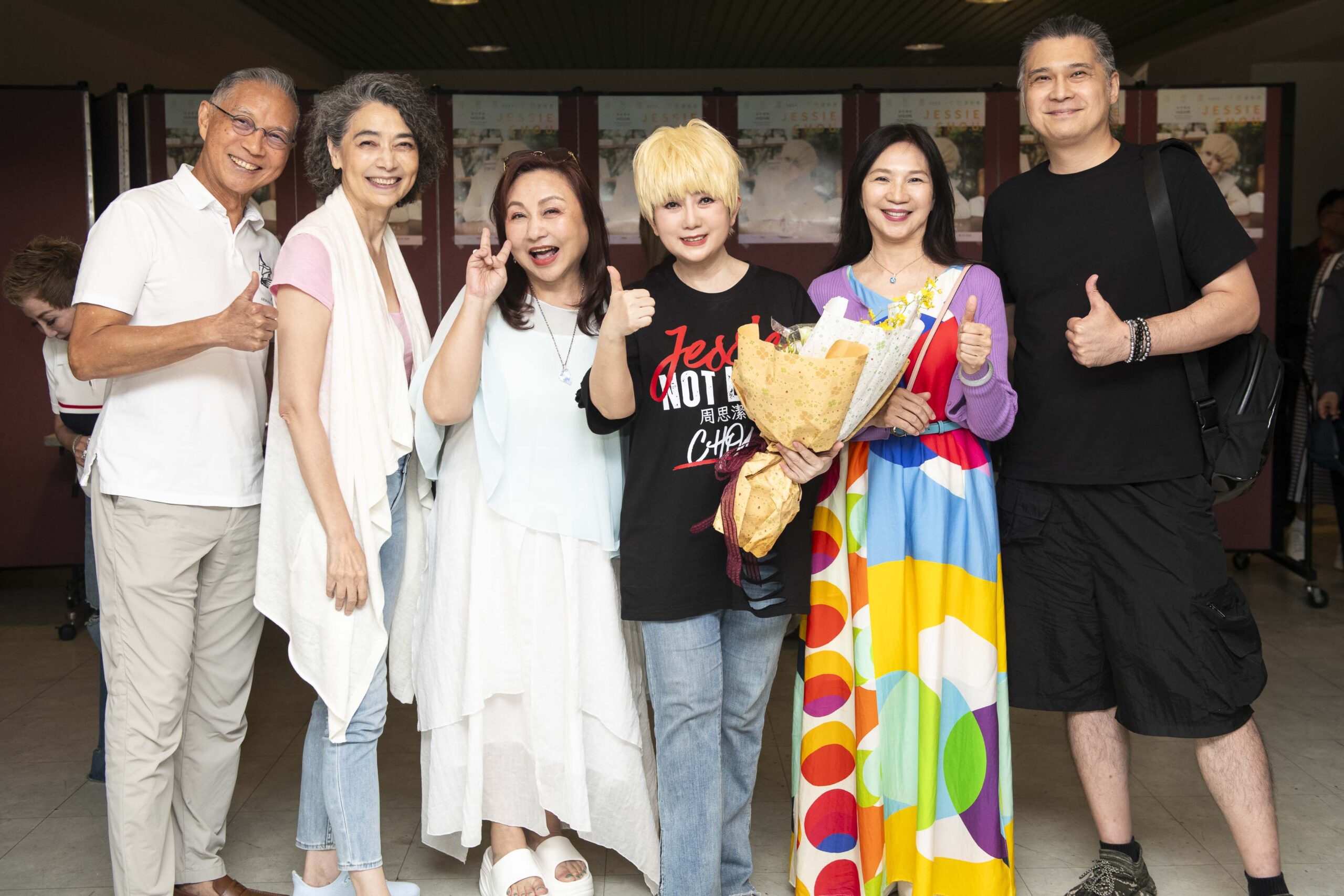 (左起)賴佩霞老公、賴佩霞、鄭怡、周思潔、小百合、工作人員在後台打氣 照片提供:大大娛樂