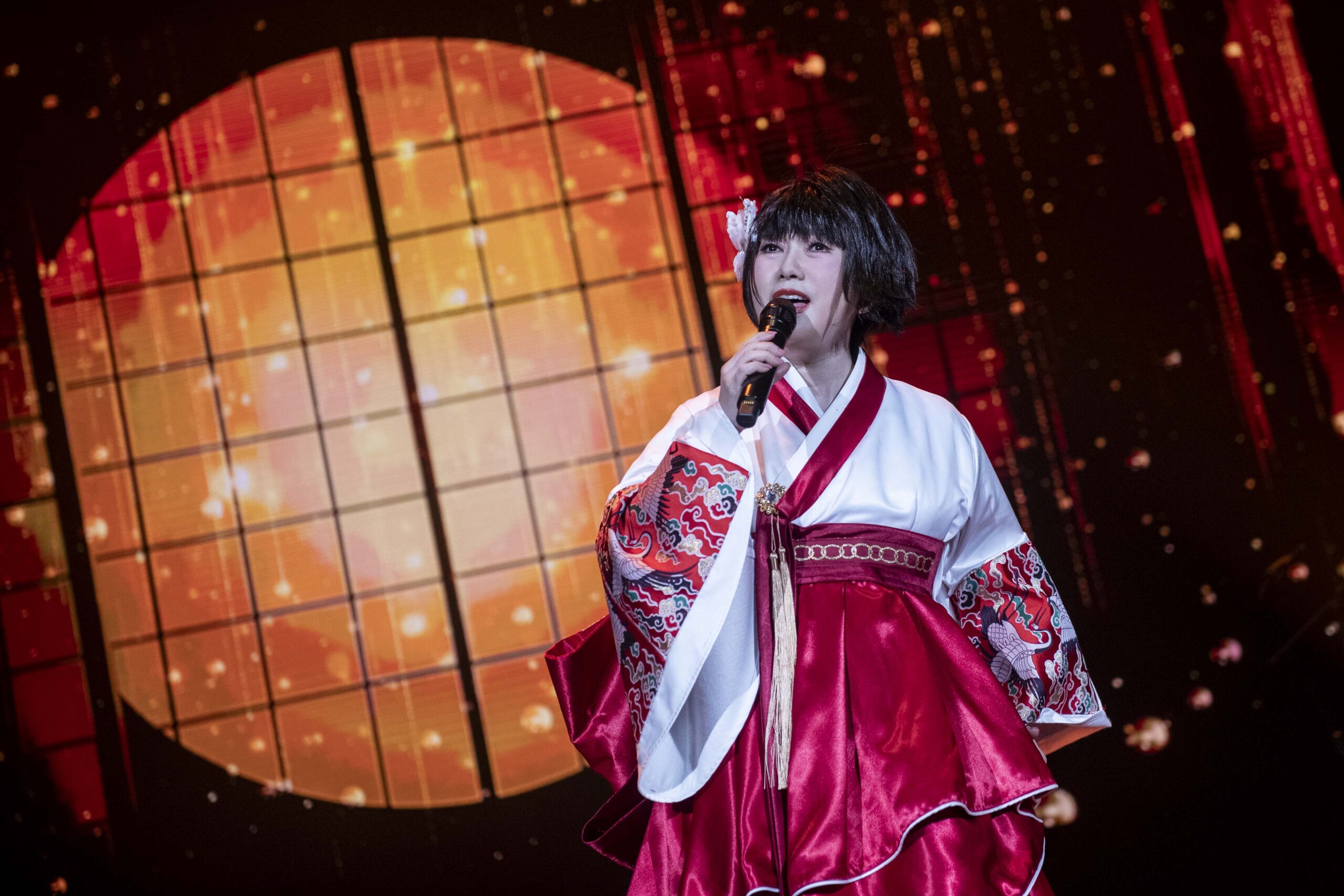 周思潔穿著和服演唱(蘋果花)、(大東京音頭)並以原唱美空雲雀的唱腔致敬。 照片提供:大大娛樂