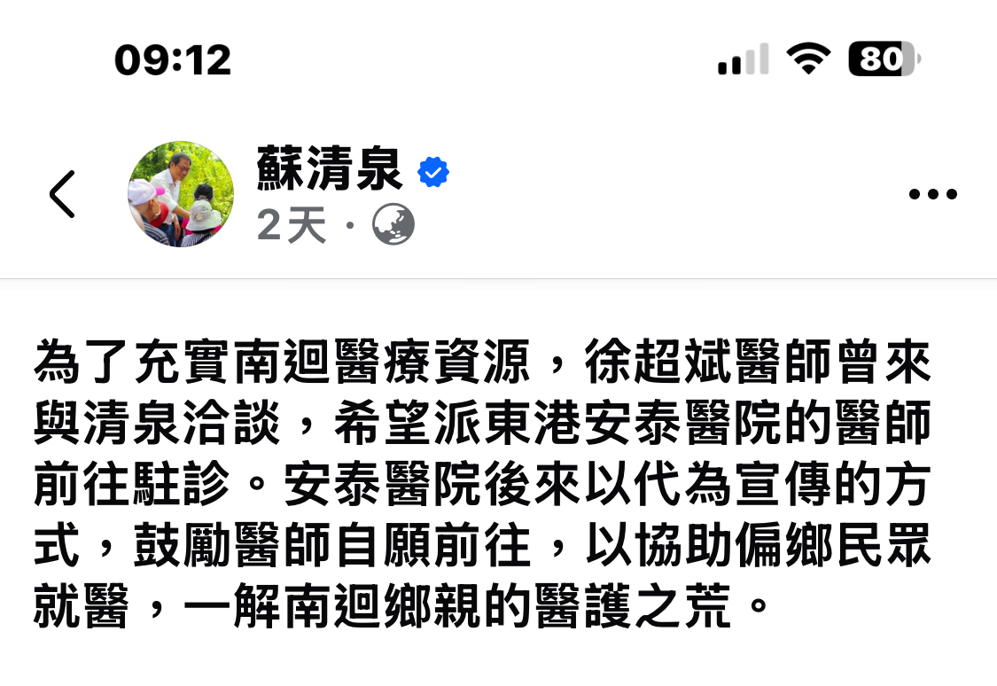 他在貼文中透露,徐超斌曾與他討論,希望安泰醫院能派醫師前往南迴駐診。但蘇清泉的做法僅止於「安泰醫院後來以代為宣傳的方式,鼓勵醫師自願前往」,並無具體政策或資源挹注。