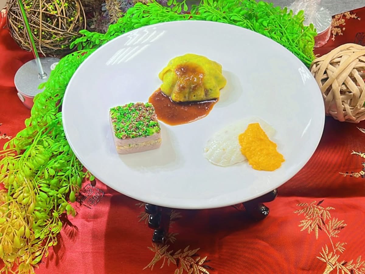 獲獎作品「頤養銀膳創三藝」以引領新食尚、營養創新料理為理念,設計3道兼具營養、創意與質地調整的銀髮友善料理組合,其中,碧珍煦光映紫樓:以甲仙芋頭蒸泥搭配乳酪、鹹蛋黃鬆與吻仔魚,柔滑細膩,溫潤療癒。青冠翠玉襯金衣:地瓜葉與糯小米融合,外裹嫩蛋皮,色澤鮮明,入口即化。金龍擁珠臥白枕:蛋白、黃魚與牛奶製成綿潤料理,靈感源自賽螃蟹,象徵富貴圓滿。3道料理運用在地農產,並透過蒸泥、去纖維與綿滑調理,改善長者吞嚥與咀嚼困難,讓飲食從能吃走向樂吃、喜吃、享受吃。