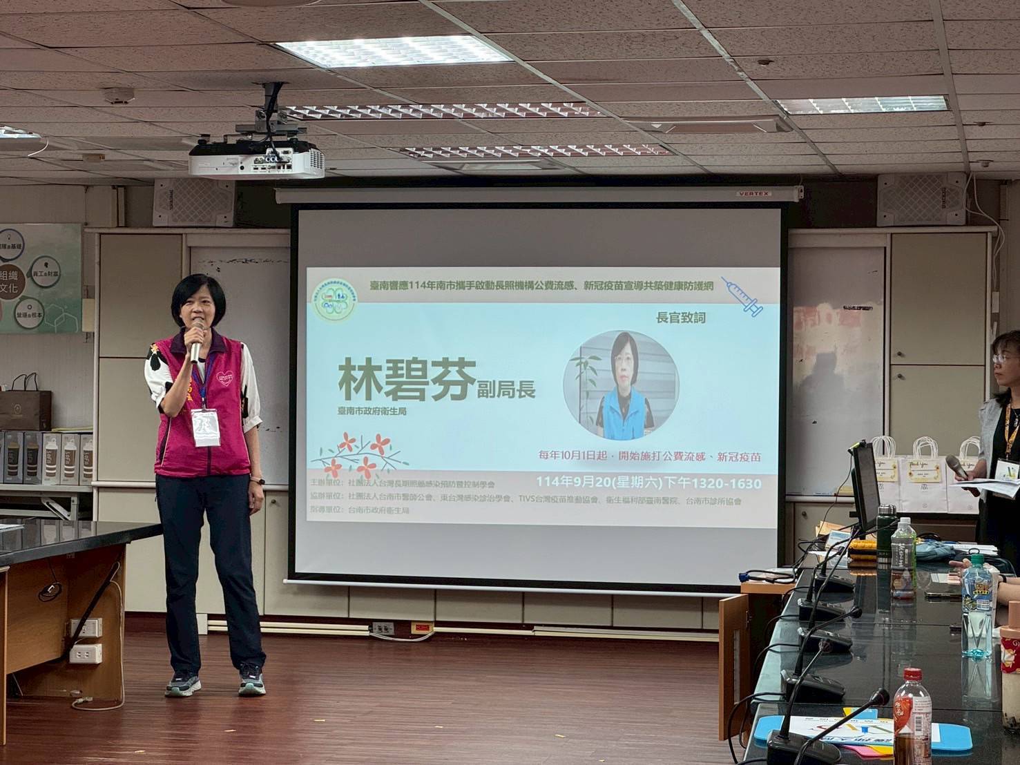 為推動長期照護機構受照顧者及工作人員踴躍接種流感及新冠疫苗,臺南市衛生局於9月20日攜手社團法人台灣長期照顧感染預防暨控制學會、社團法人台南市醫師公會、東台灣感染症診治學會、台灣疫苗推動協會、台南市診所協會及衛生福利部臺南醫院,共同舉辦「臺南響應114年公費新冠及流感疫苗研討會暨宣導活動」。