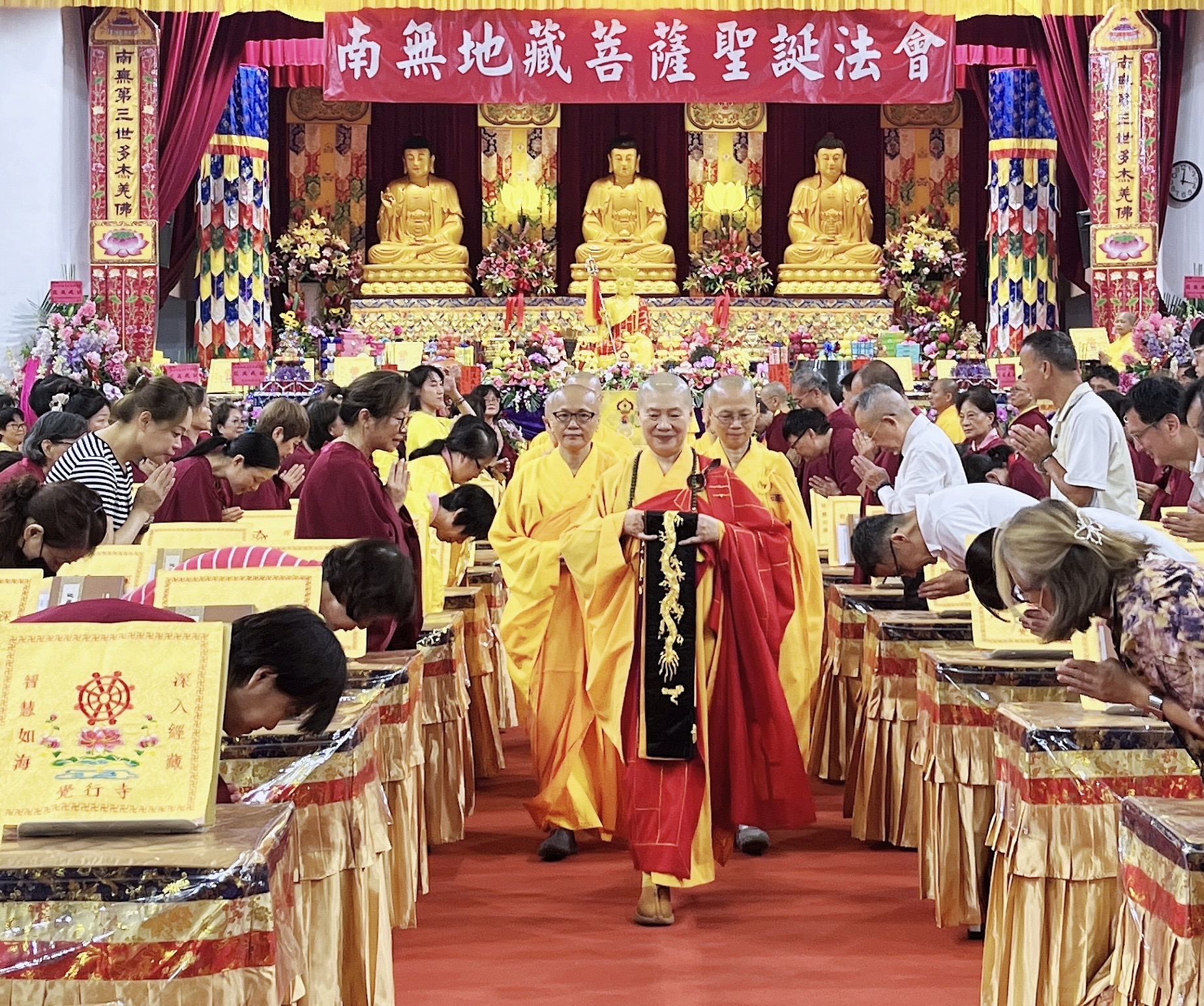 聖德 釋證達教尊主法南無地藏菩薩聖誕法會,出家師、仁波切、阿闍黎、聞法上師及善信大眾分立東西兩單虔誠恭迎。(圖:中華國際佛教聞修正法會提供)