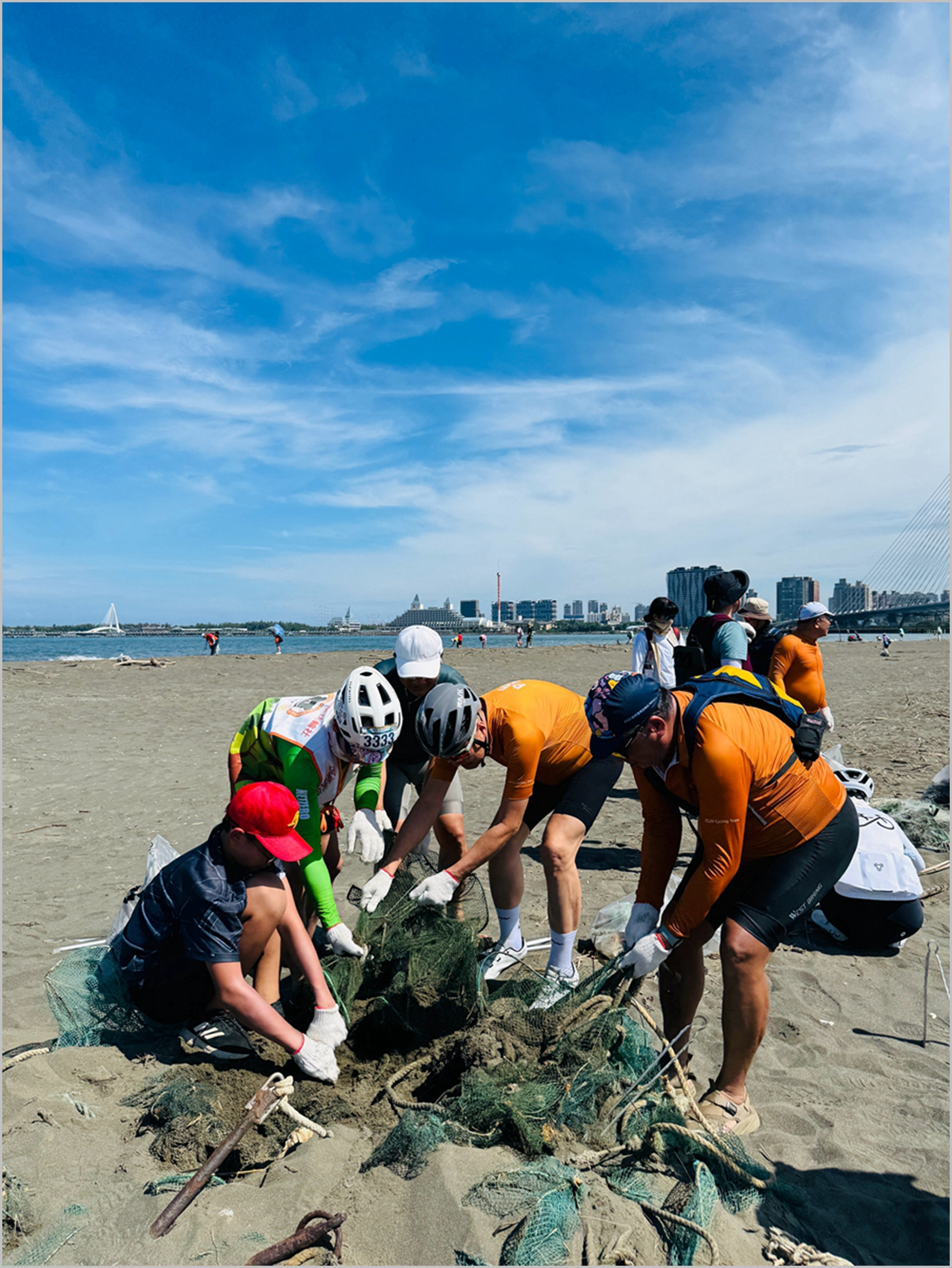 本次活動最大亮點是鼓勵社友以低碳方式前往活動現場,不少人選擇共乘、自行車或慢跑參加,實踐「減碳生活」理念。同時,主辦單位也準備了環保手套、夾子、垃圾袋,並設立醫護站,鼓勵大家自備水杯與防曬用品,從細節落實綠色參與。參與的成員中,除了扶輪社友,還包括扶青社與扶少團成員,許多家庭更是全家總動員,親子一同參與撿拾垃圾。大家分工合作,沿著淡水河口撿拾瓶罐、保麗龍、漁網、塑膠袋等海廢物品。許多社友表示,親身參與淨灘才深刻體會人類行為對自然環境的影響,也更珍惜得來不易的自然資源。