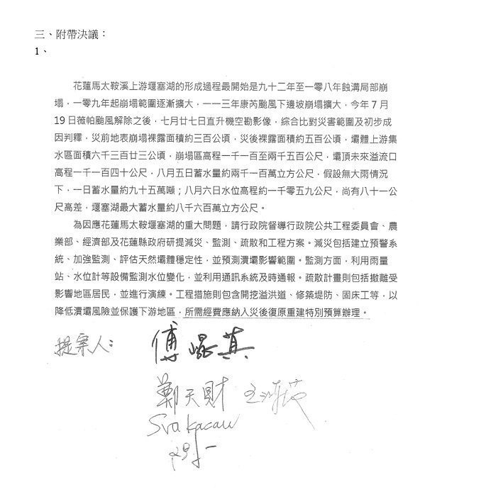 強颱「樺加沙」外圍環流帶來暴雨,花蓮光復鄉馬太鞍溪堰塞湖,23日中午出現溢流,水勢急速下洩,造成下游居民災情。國民黨總召傅崐萁表示,他早在8月13日立院協商《災後重建特別條例》時,便以附帶決議要求行政院將整治計畫納入,直言「預防堰塞湖潰壩,一天都不能等」。惟當時農業部僅評估短期無潰堤危險,如今災情發生,他呼籲中央提出長遠方案,將堰塞湖納入國家級防災工程。他重申,地方政府與花蓮人民願意全力配合,國會也會支持,唯有中央地方攜手,才能避免居民每逢豪雨就得反覆撤離,早日恢復安定生活。