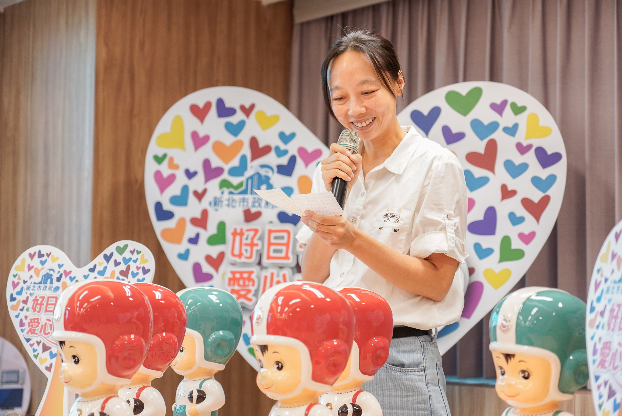 國際奔享體驗教育發展協會督導謝惠雯,讀著孩子的感謝卡。(新北市社會局提供)