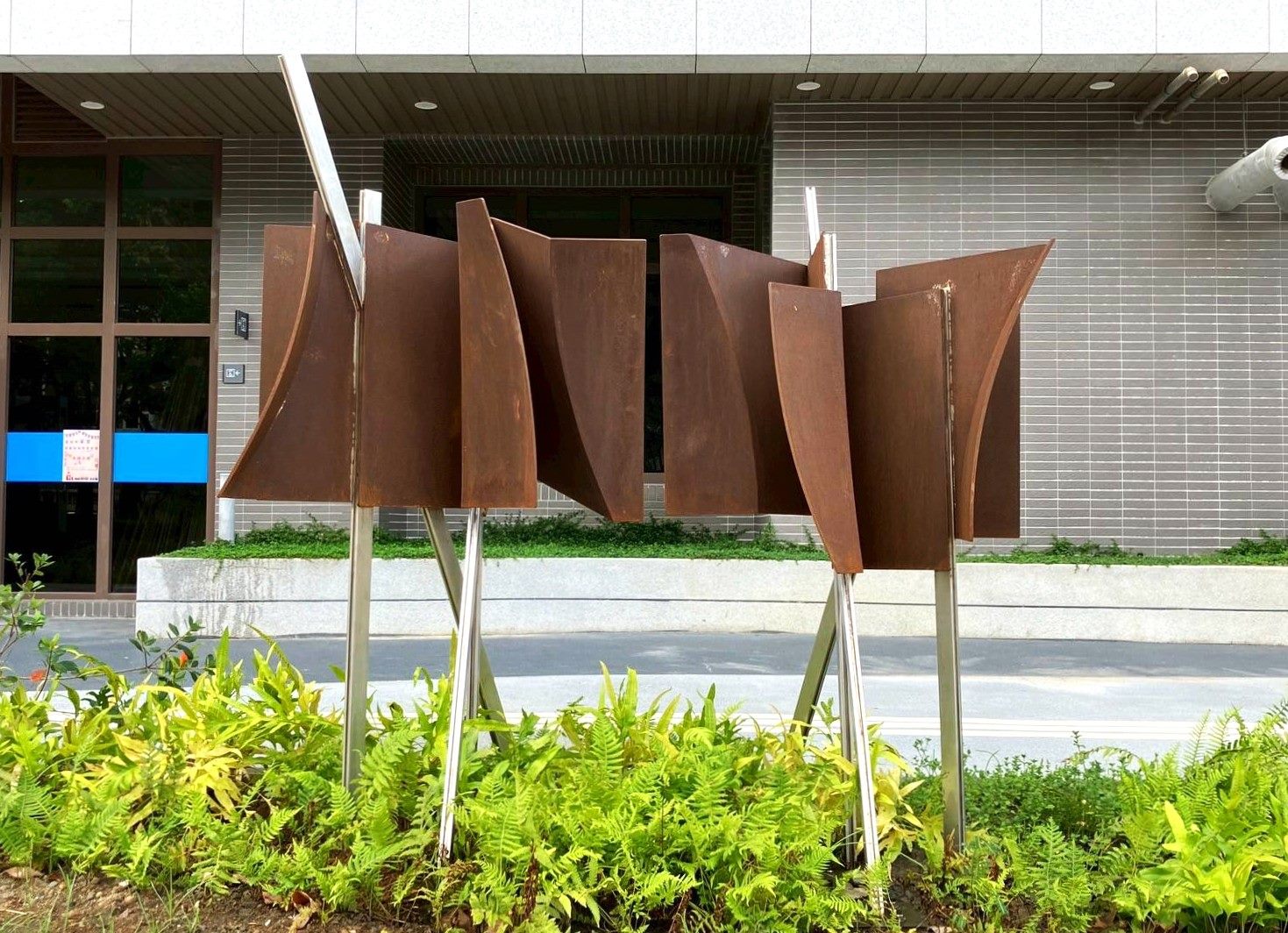 華榮市場基地的作品《一頁》,由藝術家王文心、蘇弘共同創作,作品講述基地的曾經與未來的故事,串連土地、水圳(曾灌溉本地水田的福德洋圳)、田地與家園。坐落在基地植栽槽中的這組作品,王文心以土壤、草坡和植物詮釋這片土地的記憶,並在各區植栽槽運用大量原生植物回應不同時期人們與土地互動的軌跡;蘇弘則將創作過程的當下、環境與感受,化成一座漂浮的金屬雕塑。藝術家表示,創作特別選用鏽化鋼板,隨著時間展現自然生鏽、斑駁的紋理,更能體現時間的變化與美感。而雕塑的型態有如一本本翻開的書頁,與地景相應,係藝術家透過藝術作品留在地表上的「一頁」書寫,供人們閱讀其蘊含的在地紋理與線索。