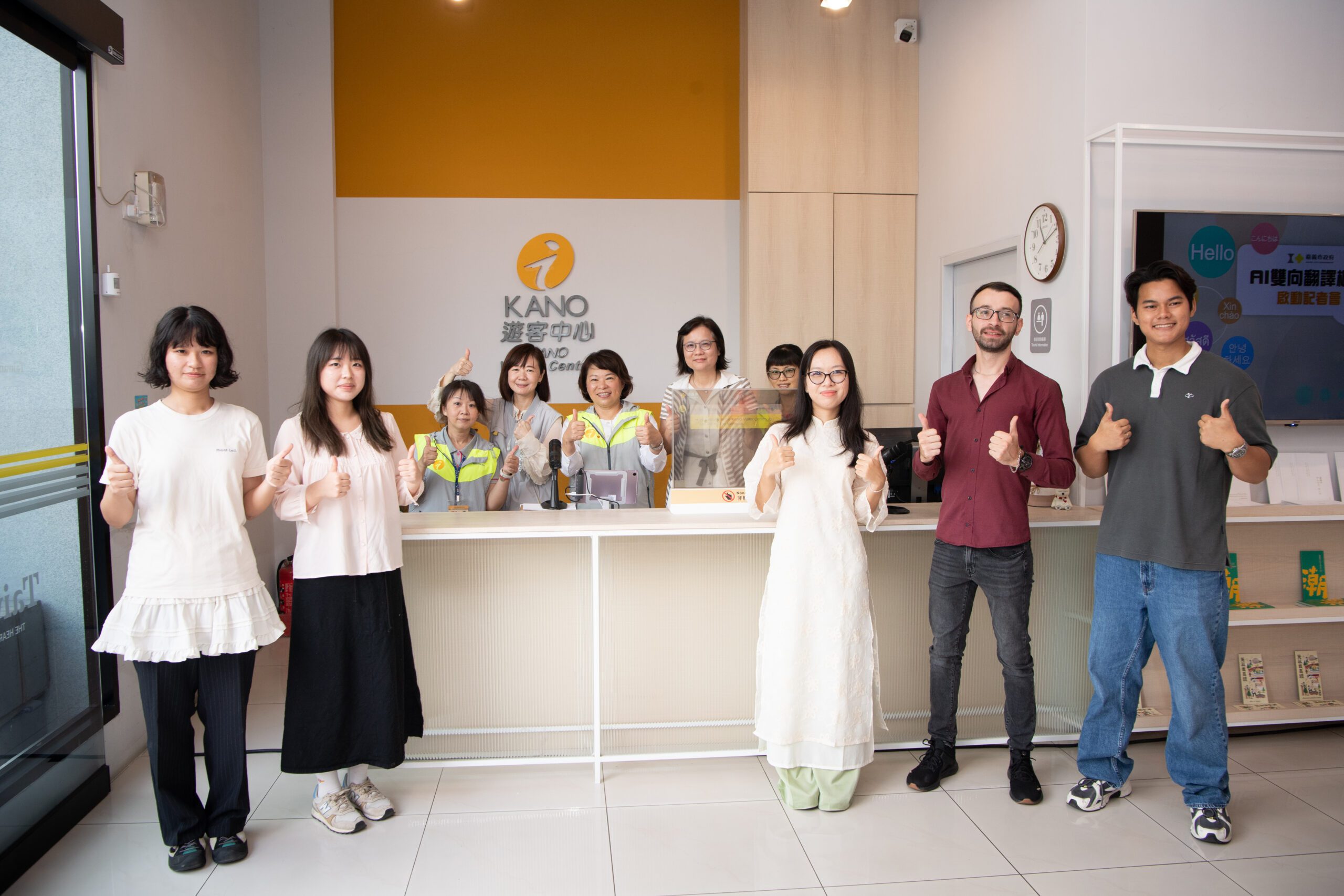 記者會現場氣氛熱絡,特別邀請嘉義大學5位外籍學生化身觀光客,由黃敏惠親自擔任「一日旅服人員」,親身體驗AI翻譯的即時互動。學生們用母語詢問:「怎麼搭高鐵?」「洗手間在哪裡?」AI翻譯機立刻回應、語音流暢自然,讓中外對話笑聲不斷。來自日本的學生坂本彩夏開心地說:「這台翻譯機真的很方便!我可以直接用日文和志工聊天、問路,不需要再打字翻譯。嘉義市對外國人真的很貼心,也讓我更想推薦朋友來旅行。」