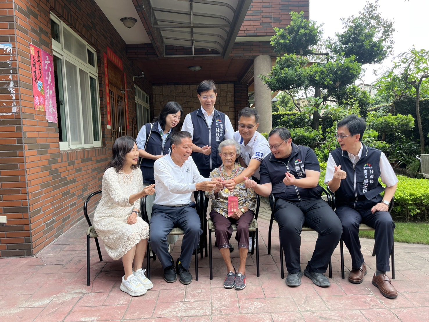 合照前大家教阿嬤比愛心
