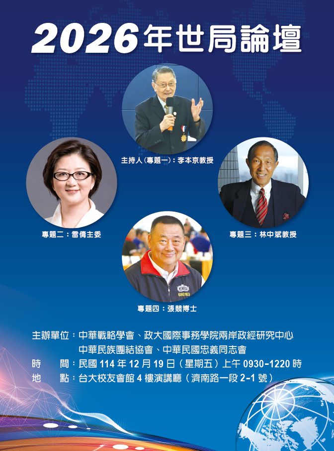 「2026年世局論壇」是由中華戰略學會、政治大學國際事務學院兩岸政經研究中心、中華民族團結協會、中華民國忠義同志會聯合舉辦,並由李本京教授、魏艾教授、夏瀛洲上將、徐炳強將軍共同主持。