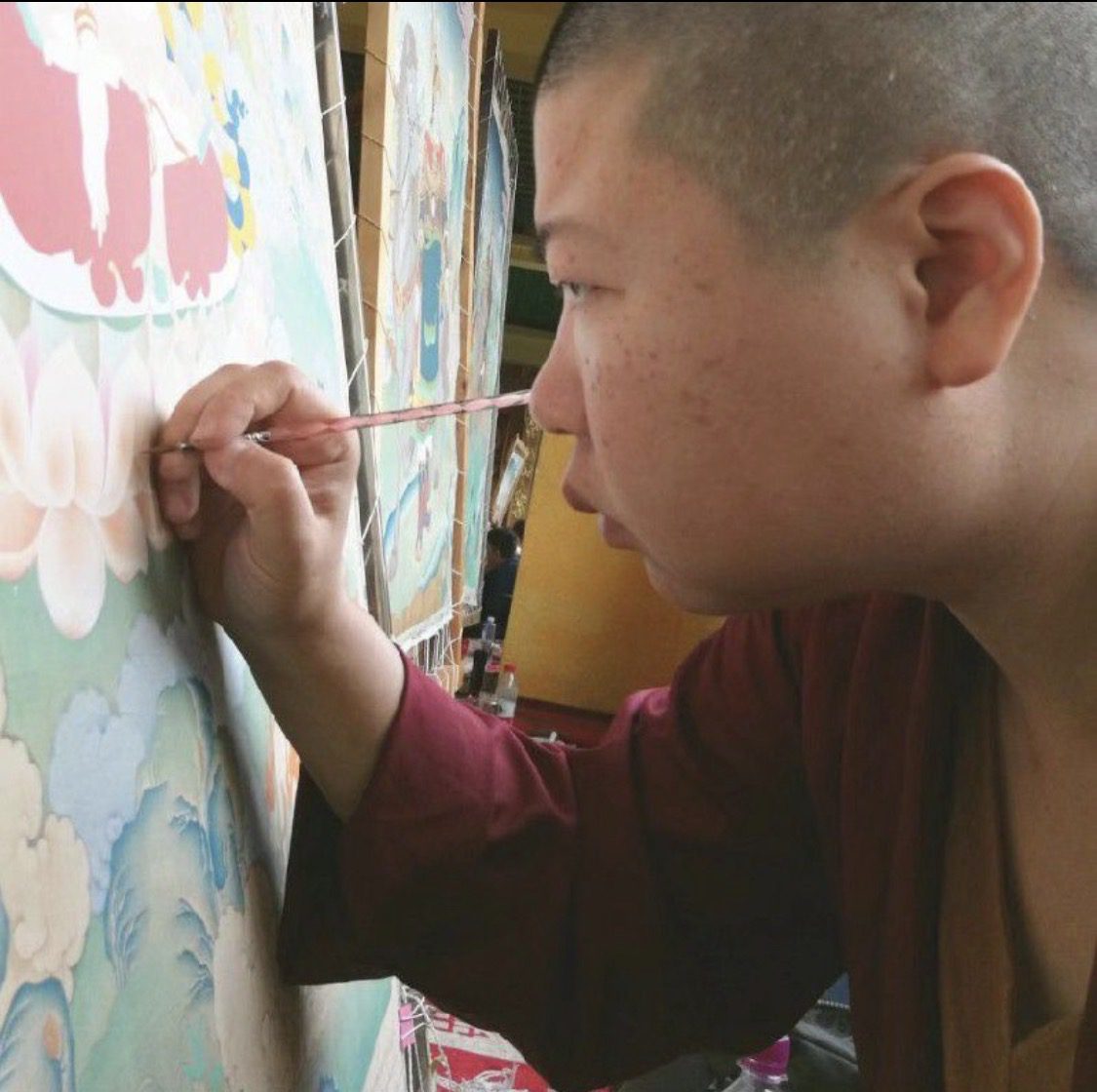 2010年起,她投入創作,嘗試手捏陶、拉坯、工筆花鳥等媒材,卻在唐卡藝術中感受到一種近乎「前世熟悉」的召喚。2016年,她於 噶陀仁珍千寶仁波切 座下出家,後因深入反思修行形式與自身使命,選擇離開寺院體制,轉而前往四川成都,正式拜中國藏族唐卡 國家級非物質文化遺產傳承人拉孟老師 為師,成為其在台灣的唯一弟子。