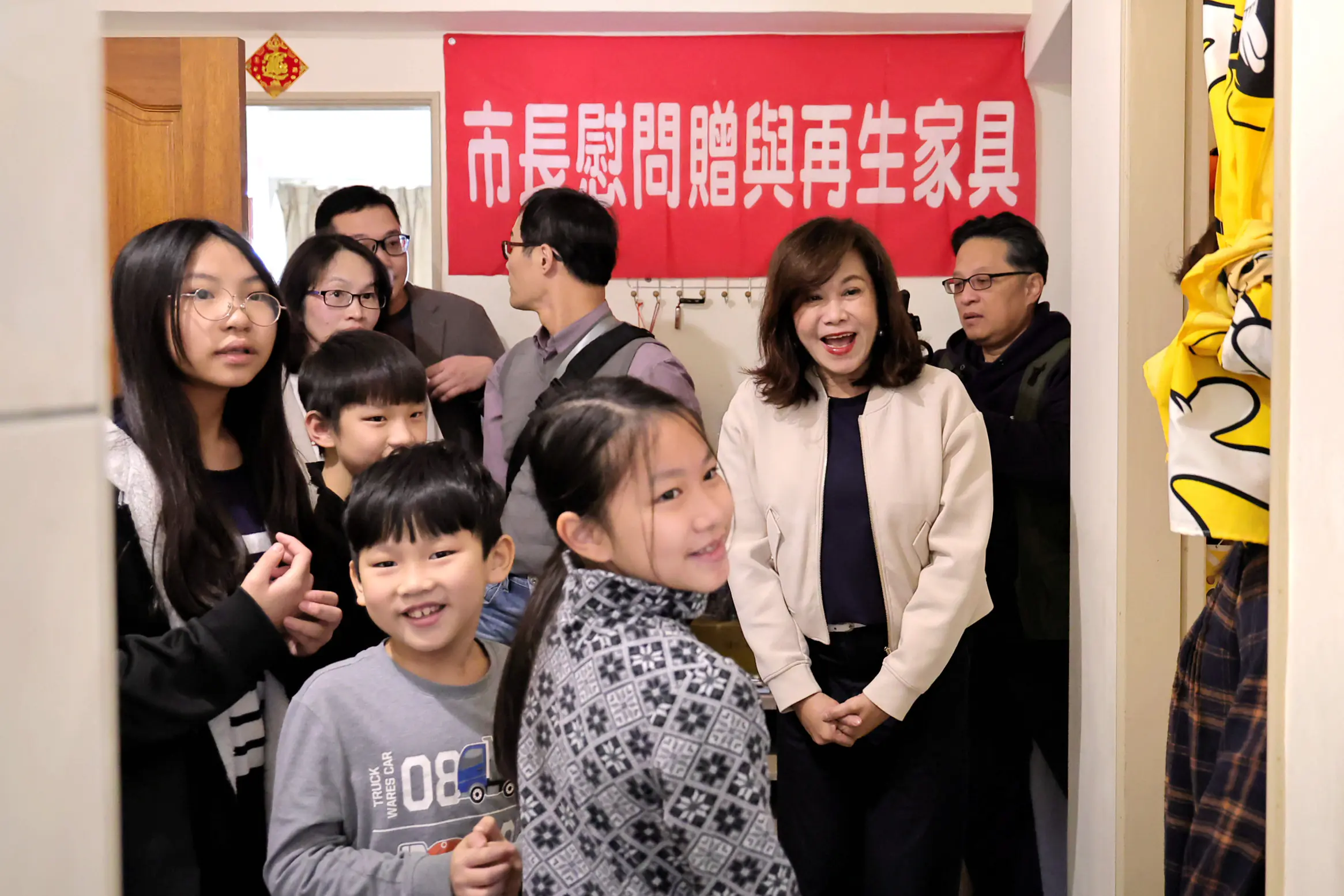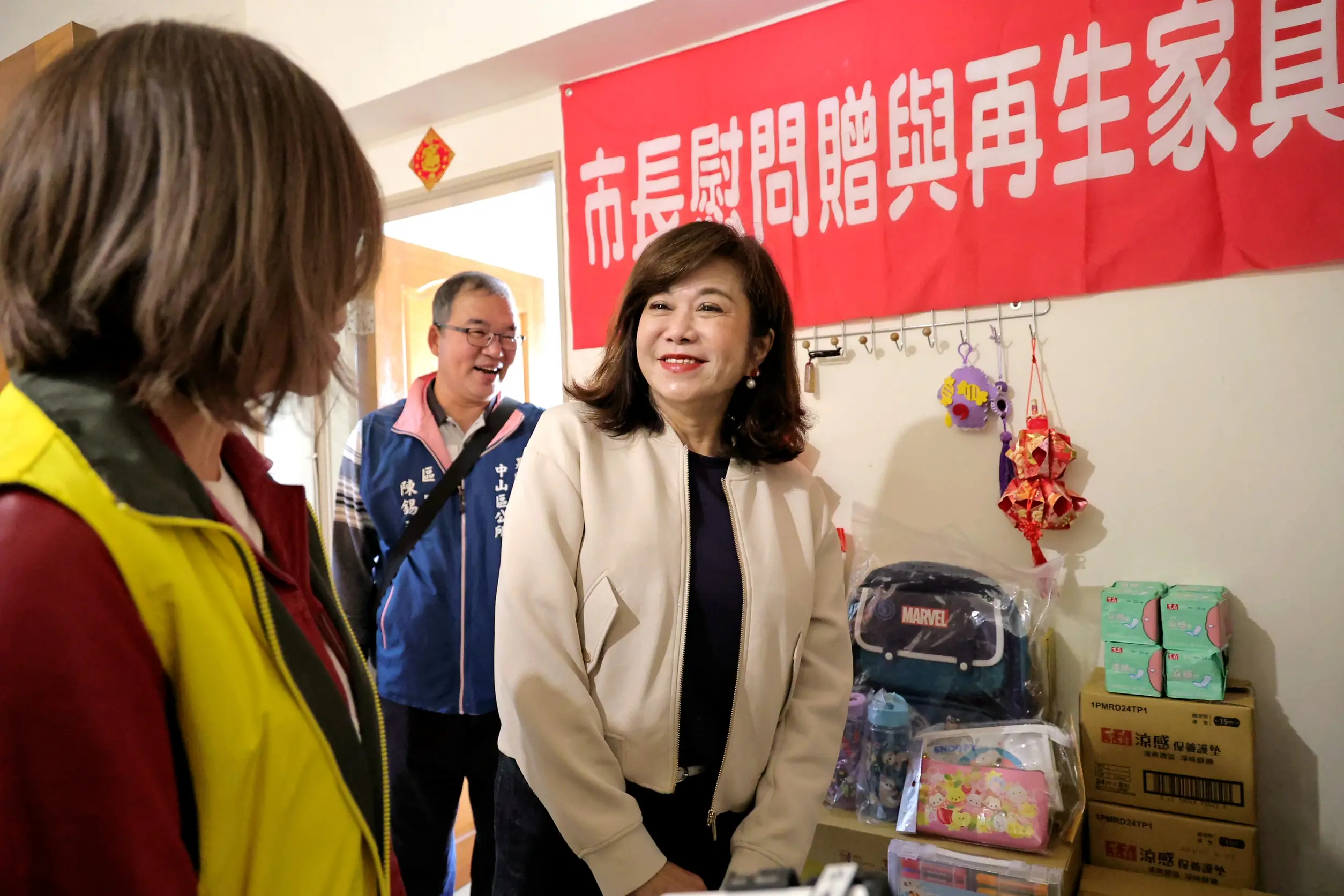 農曆春節將至,為讓弱勢家庭安心迎接新年,副市長邱佩琳今(4)日上午代表市長謝國樑,會同環保局局長馬仲豪、社會處副處長盛慧中、中山區公所區長陳錫洺、文化里里長潘誼樺及清潔隊木工班成員,前往雷姓市民家中關懷慰問,致贈由環保局修繕完成的再生家具,以及社會處與兒少處準備的生活物資、福袋及玩具,提前送上新年祝福,讓受助家庭感受到市府實際而溫暖的關懷。