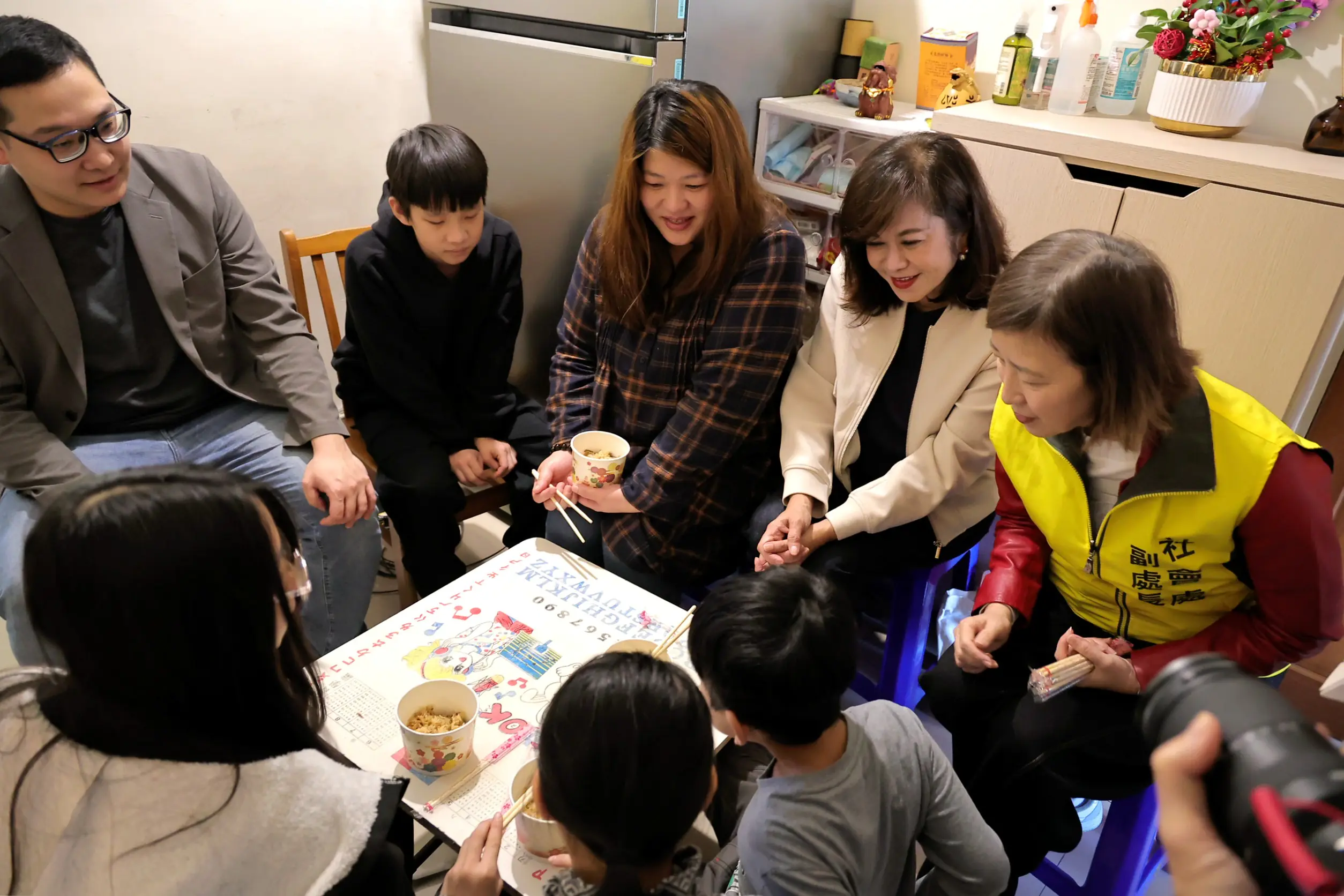 除再生家具外,社會處同仁亦準備多項食品、生活用品與文具,並貼心提供麻油雞湯與油飯,讓家庭共享溫暖年味;兒童及少年事務處則致贈內含保溫瓶與襪子的福袋,祝福孩子們在新的一年平安健康、溫暖過節。