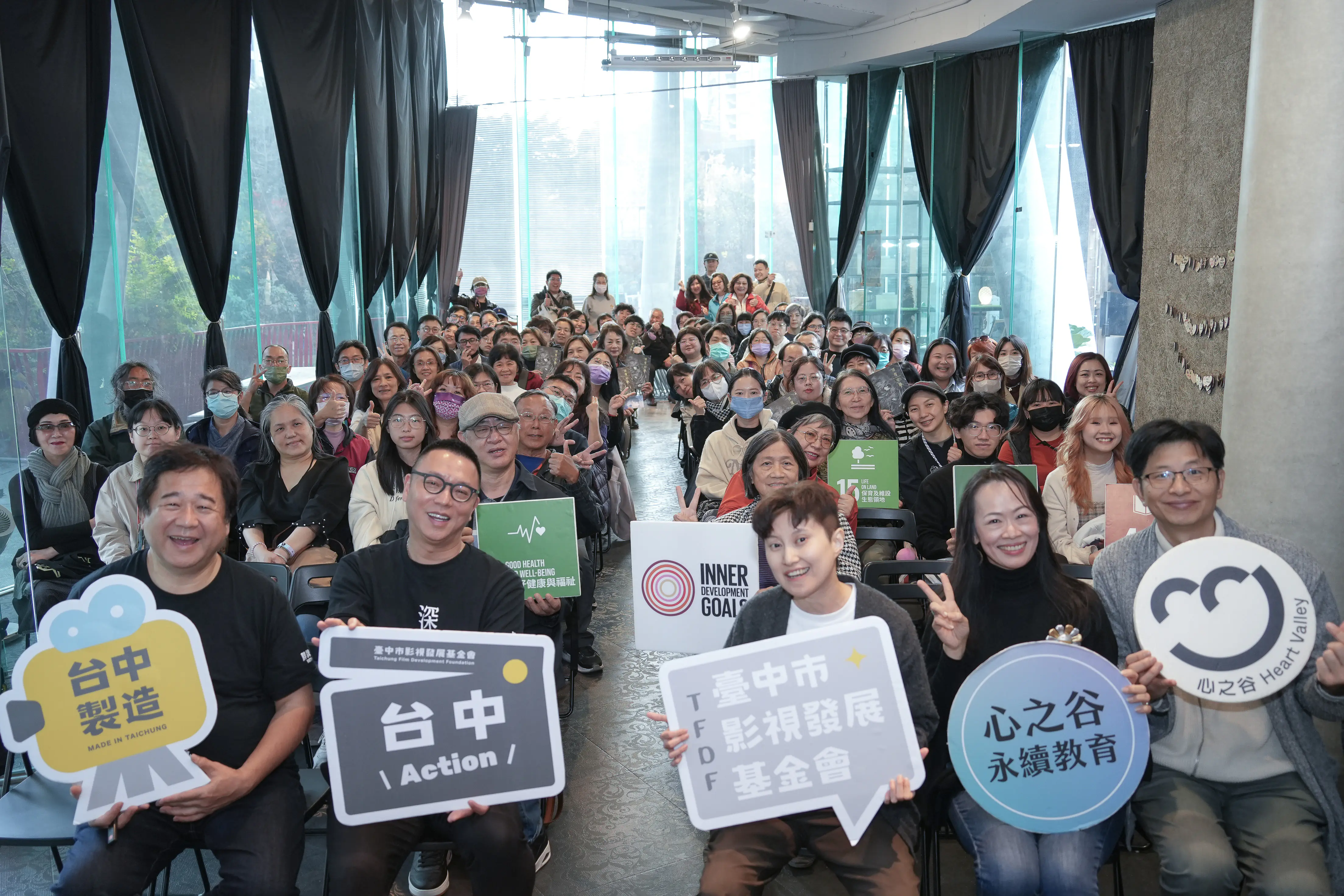 左起心之谷永續教育園區創辦人蕭順基、文蓓蓓、導演沈可尚、瞿友寧及台中市影視發展基金會執行長張婉榆合影