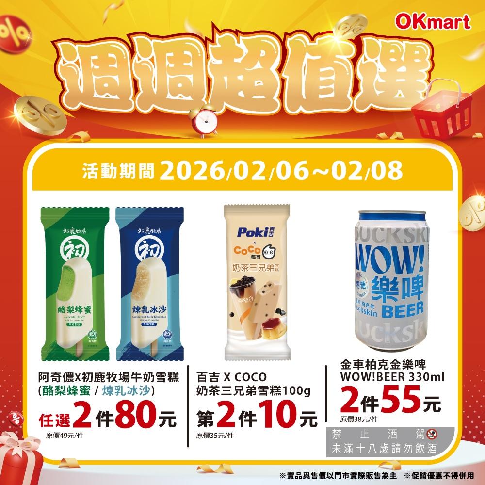 另外,OK會員周週超值選活動期間即日至2月8日,「金車柏克金樂啤酒WOW!BEER」 330ml(酒)」2件55元(原價38元/件);「阿奇儂X初鹿牧場-酪梨蜂蜜牛奶雪糕」、「阿奇儂X初鹿牧場-煉乳冰沙牛奶雪糕」任選2件80元(原價49元/件);「百吉XCOCO奶茶兄弟雪糕100g」第2件10元(原價35元/件)。