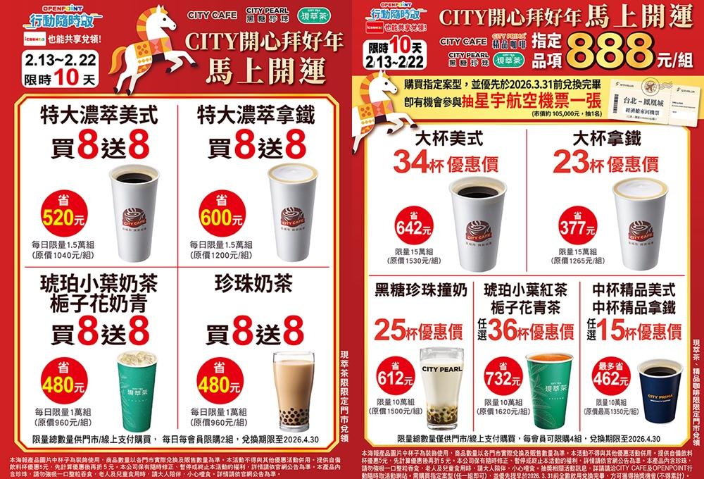 OPENPOINT行動隨時取2月13日至2月22日推出「CITY系列馬年馬上開運888元」指定CITY系列產品組合,以及「買8送一路8發發」優惠組合,飲品族要先買。