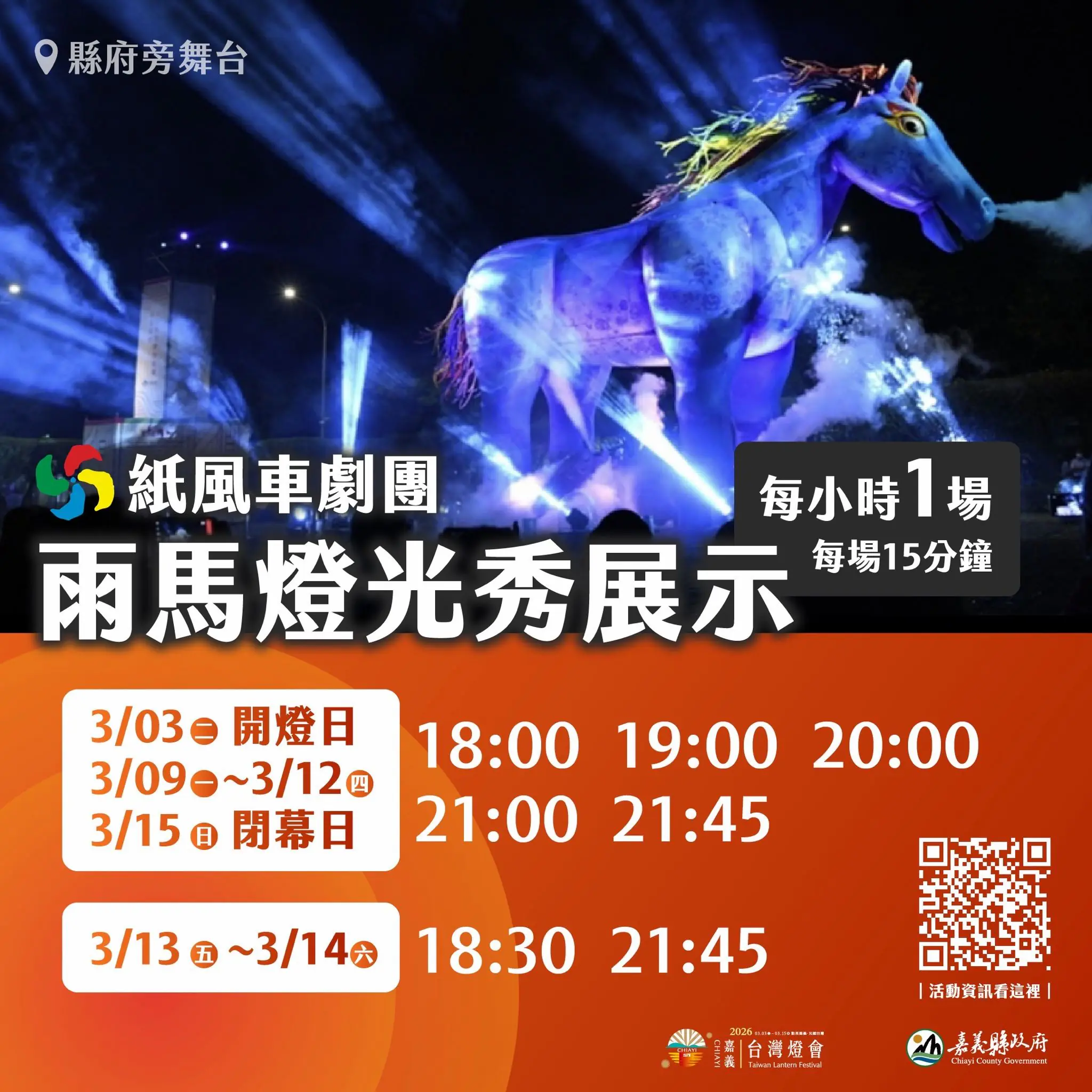 嘉義縣文化觀光局提到,「雨馬」精華版演出與燈光秀場次中將安排問答活動,準備限量小禮物與觀眾同樂,讓孩子在參與過程中留下難忘回憶。活動期間還有機會獲得可愛的「小雨馬布偶」,把燈會的幸福祝福帶回家。